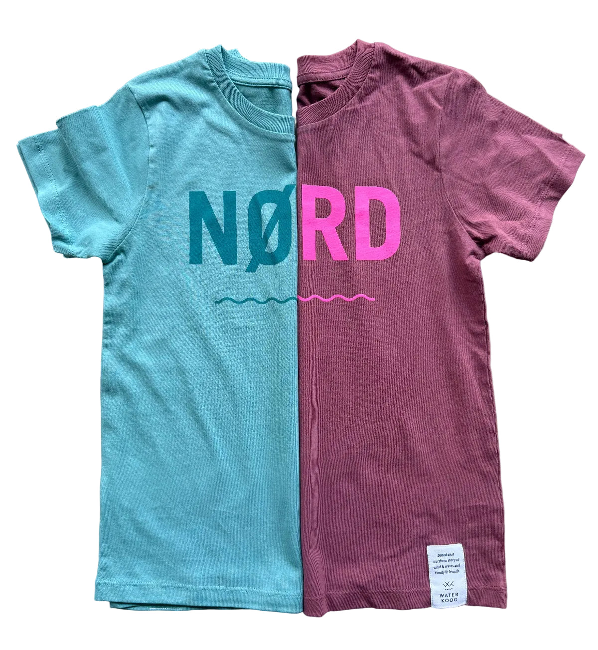 Our NØRD t-shirts in hibiscus or sage green for kids are a perfect match for northern adventures and daily matches.